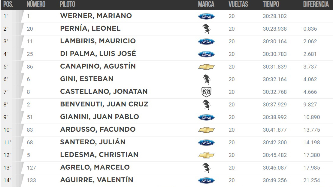 Mariano Werner convertido desde hace un tiempo a esta parte como el máximo referente de los fanáticos del “Ovalo”, no solo hizo la pole el sábado, ganó la serie mas rápida de hoy y en la final no se inmutó para ganar sin atenuantes la final.