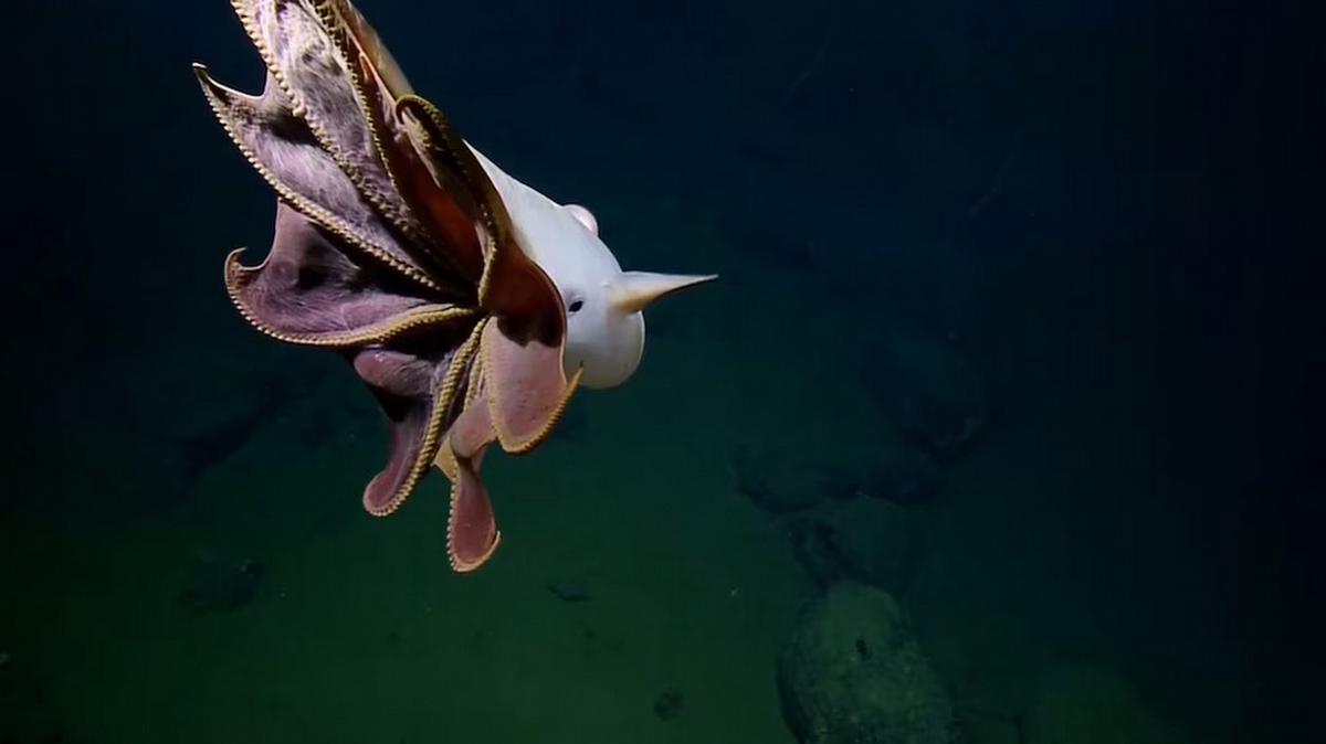 Se trata de un cefalópodo de tonalidad rosada que sorprendió a los investigadores de la expedición por su rareza y belleza. El animal fue observado sin perturbar su hábitat.