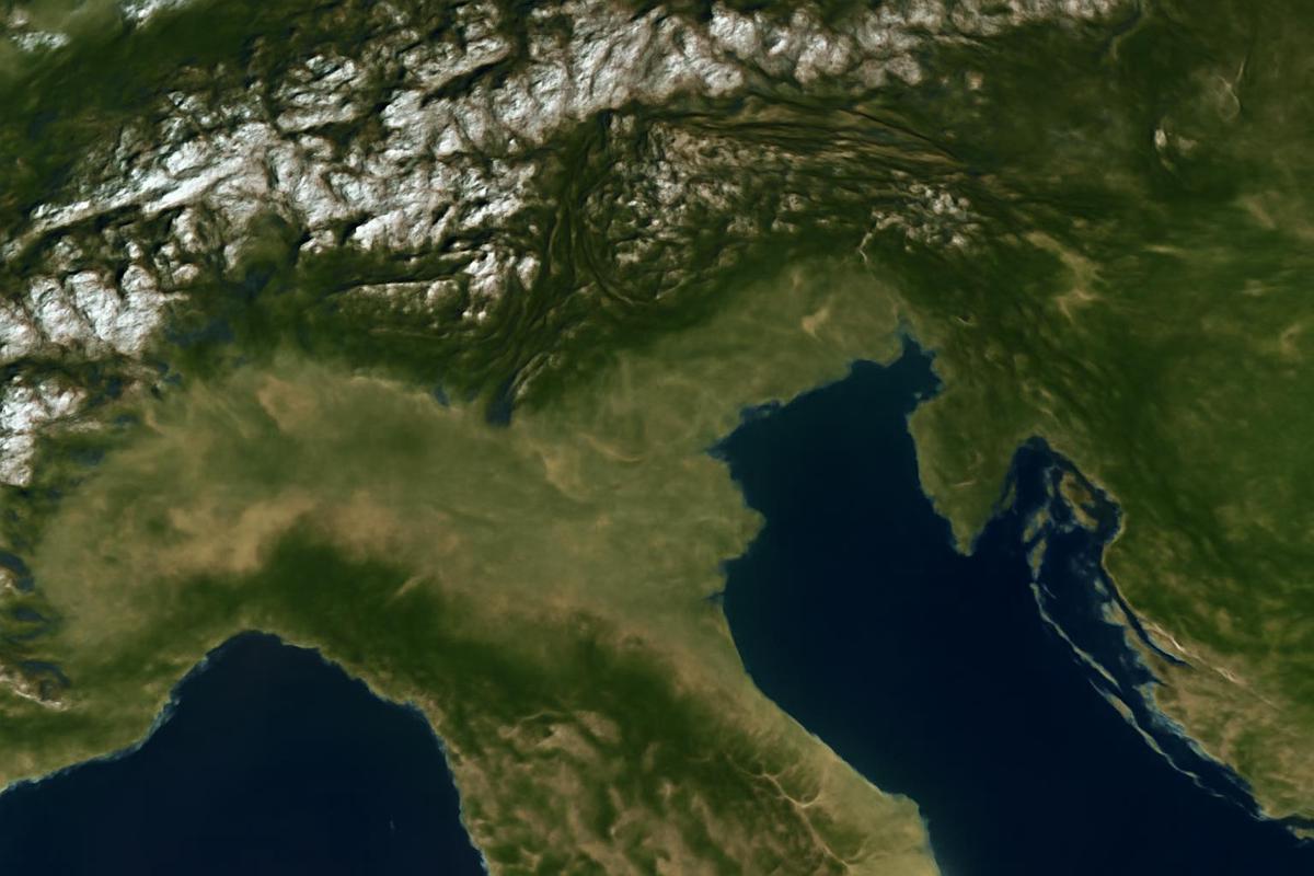 En la esquina inferior derecha de la imagen, se observó otro ícono italiano: la laguna de Venecia, que brilla en tonos turquesas, revelando la red de islas que conforman la ciudad flotante de Venecia a lo largo de la costa adriática.