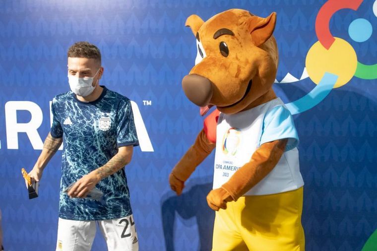 El jugador del Sevilla fue elegido por la organización del certamen como "el goleador" del encuentro en el que Argentina derrotó a Paraguay. Al recibir el premio improvisó su clásico baile junto a “Pibe”. Video.