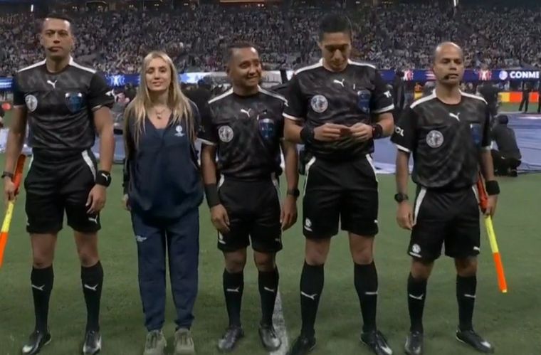 La periodista de ESPN e influecer argentina Morena Beltrán estuvo parada al lado de los árbitros del encuentro y permaneció allí durante todo el sorteo preliminar, en una imagen poco frecuente en el fútbol del día a día.