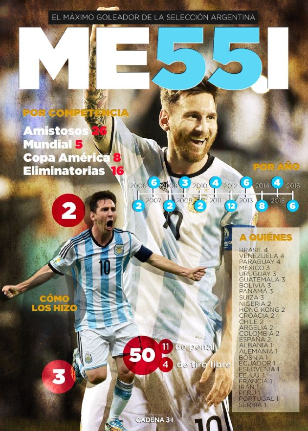 Con su golazo de tiro libre ante EE.UU., “La Pulga” alcanzó las 55 conquistas en la Selección y dejó atrás el récord del delantero Gabriel Batistuta.Entrá y mirá la infografía.