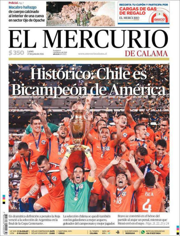 Además, recalcó: "Tal como el año pasado la "Roja" se impuso a los trasandinos en dramática definición y sumó su segundo título continental. Lionel Messi falló su remate y Claudio Bravo volvió a ser el héroe".