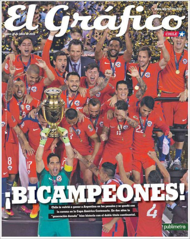 Los medios chilenos elogian a su seleccionado de fútbol y la calificaron como "la mejor de su historia", tras el bicampeonato obtenido anoche en la Copa América Centenario de los Estados Unidos, luego de vencer al representativo argentino en la tanda de los penales.