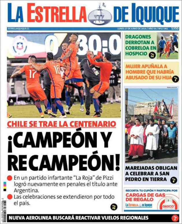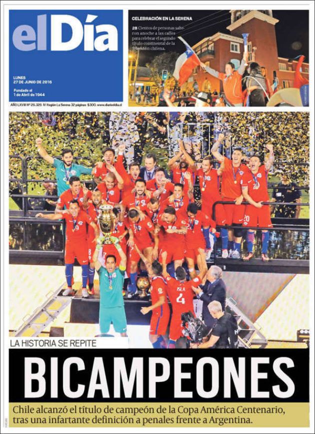 "La historia se repite: Chile es bicampeón de América tras ganar en penales a Argentina", anunció el sitio web de Emol en su portada.