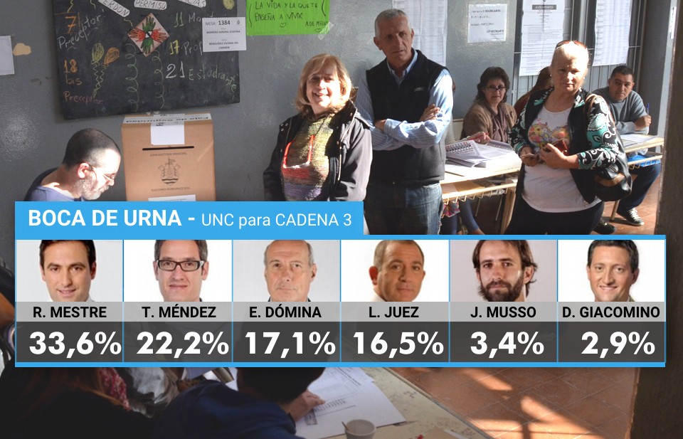 El relevamiento realizado para Cadena 3, posicionó a Mestre (33,6 %), Méndez (22,2) , Dómina (17,1), Juez (16,5), Musso (3,4), Giacomino (2,9) y Echevarría (1,9).