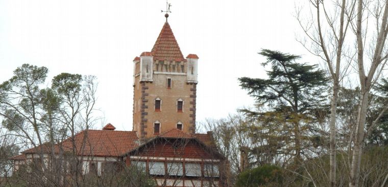El Castillo de Roger Agst asoma en medio de las sierras que rodean la localidad de La Granja. Se puede ver una torre color anaranjada con tejas rojas que termina en una veleta de viento.