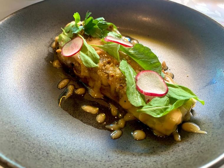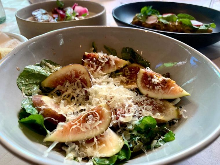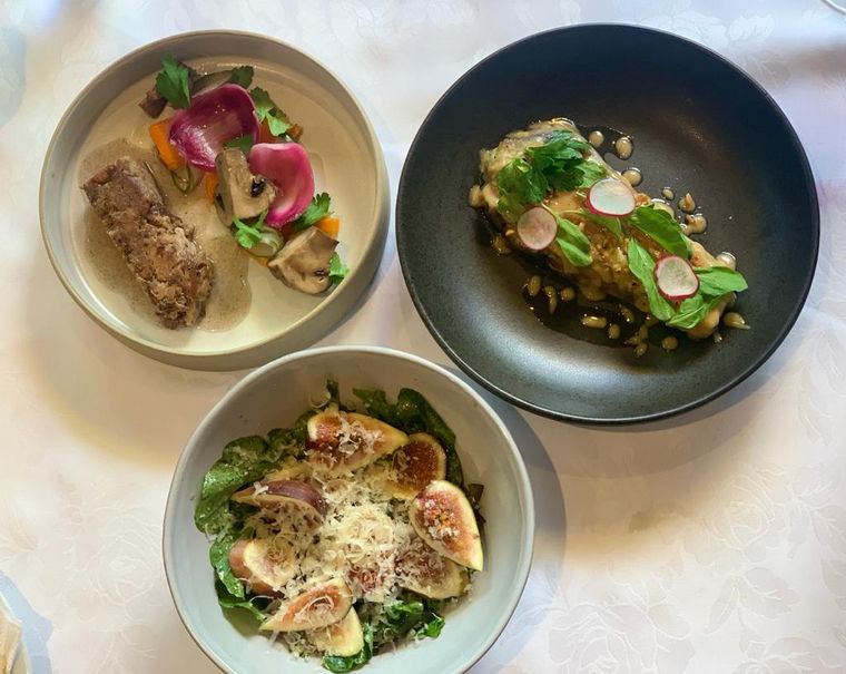 La periodista de Cadena 3 Marcela Psonkevich almorzó en el restó y degustó un mix de entradas: berenjena asadas, maní, miel y hojas verdes; higos de temporada, hojas verdes, queso y vinagreta de miel serrana; y un plato de confi de cabrito con vegetales encurtidos. El plato principal, en tanto, fue fideos cinta con panceta y brócoli.