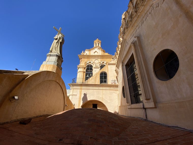 Luego comienza el ascenso por las escaleras laterales, que también fueron reemplazadas porque las originales ya no eran seguras. Eso nos lleva al segundo momento: un patio / terraza que une las dos torres campanarias de la iglesia. Allí se puede ver de cerca el Cristo de la fachada, que impresiona por su tamaño.