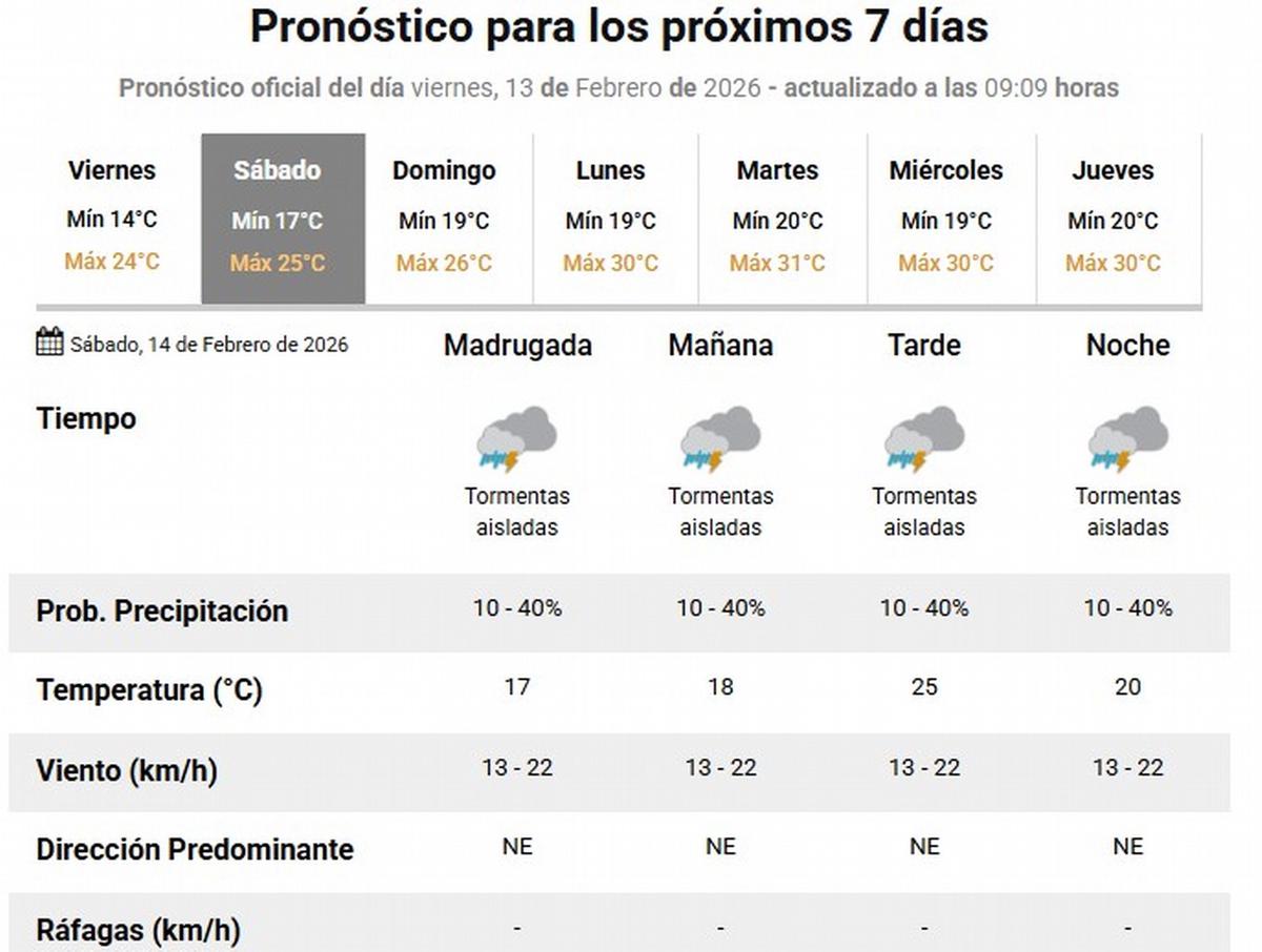 Para el sábado 14 de febrero, el SMN pronostica una mínima de 17° y una máxima de 25°, con la probabilidad de tormentas aisladas la mayor parte del día y vientos moderados del noreste.
