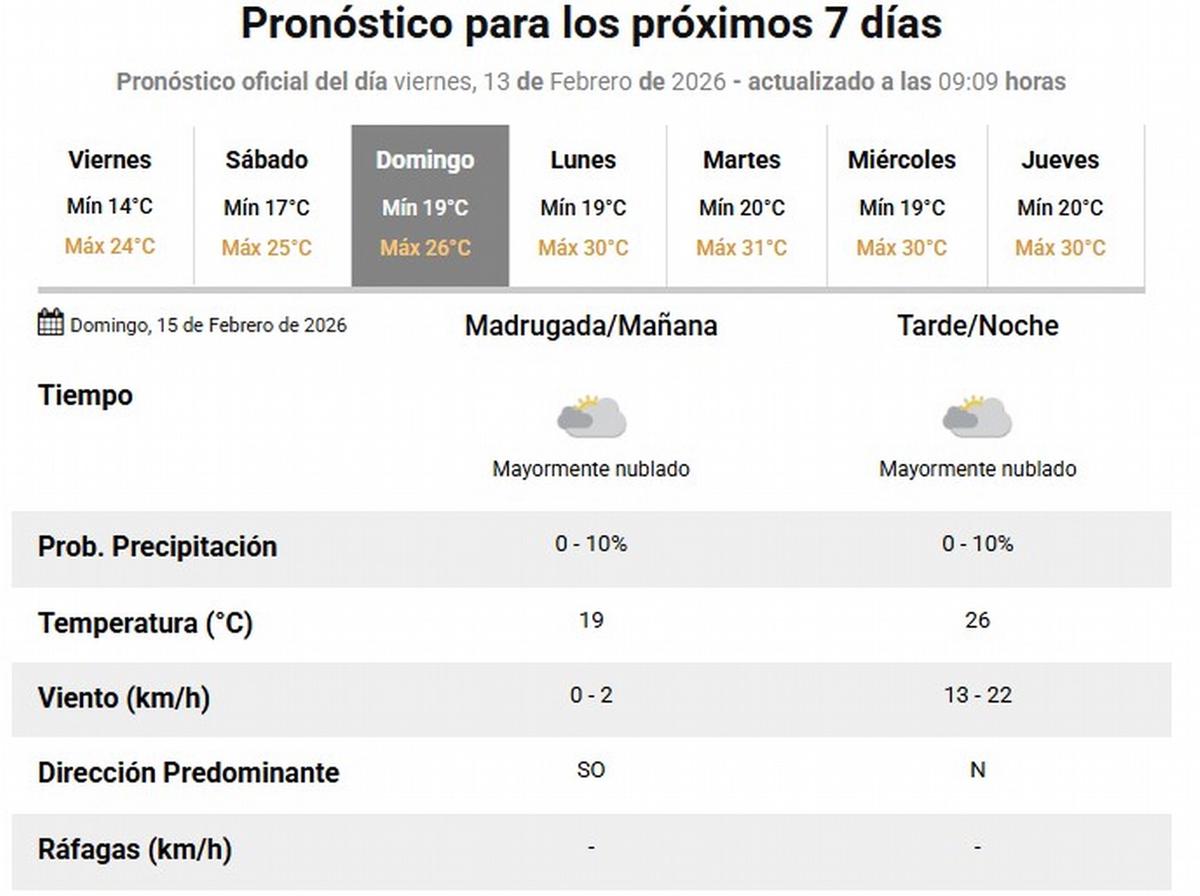 En tanto, para el domingo 15 se prevé un mejoramiento de las condiciones meteorológicas. La mínima será de 19° y la máxima alcanzará los 26°. El cielo estará mayormente nublado la mayor parte del día, aunque el SMN descartó la posibilidad de lluvias para la segunda jornada del evento. El viento será muy leve a moderado del suroeste, con rotación al norte.