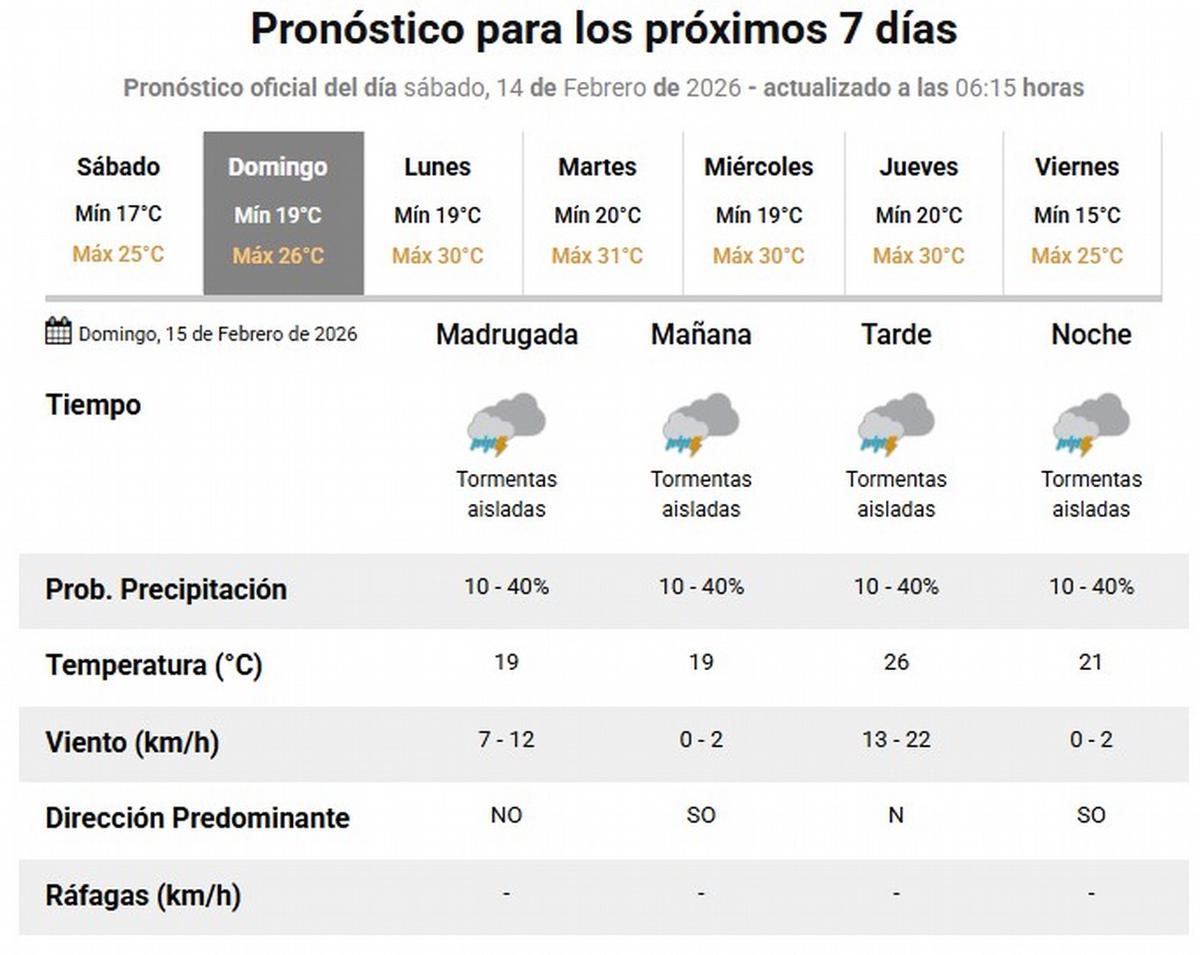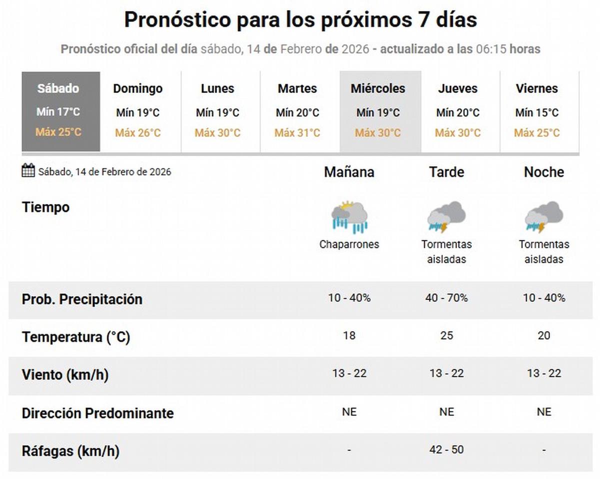 Para el sábado 14 de febrero, el SMN pronostica una mínima de 17° y una máxima de 25°, con la probabilidad de chaparrones y tormentas aisladas la mayor parte del día (con mayores chances hacia la tarde) y vientos moderados del noreste, con ráfagas de hasta 50 kilómetros por hora.