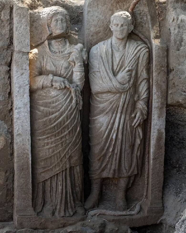 El relieve, que presenta a la pareja esculpida “casi a tamaño natural”, forma parte de una sepultura de grandes dimensiones en la necrópolis de Porta Sarno. Esta tumba se caracteriza por un gran muro con varios nichos, culminando en el relieve de estas dos figuras, “quizás un matrimonio”, precisó el Parque en un comunicado.