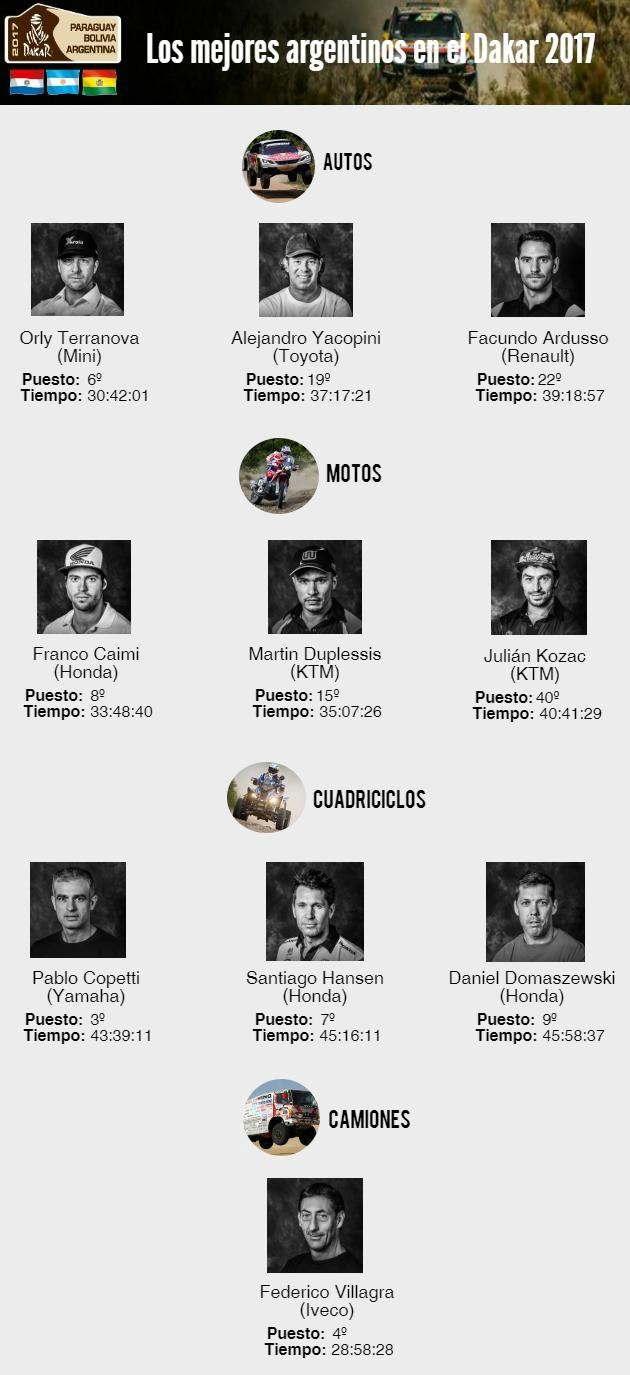 Los pilotos argentinos marcaron presencia en el Rally Dakar 2017, que culminó ayer en Buenos Aires, en un raid donde tuvieron que afrontar calor, frío, la altura de Bolivia y diversas complicaciones en la ruta.