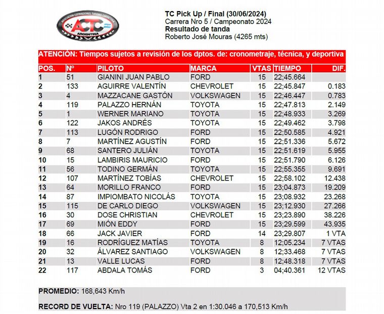 La contundencia de Gianini fue desde el semáforo en verde de la partida hasta el banderazo del final, soportando los embates en la primera parte de la carrera de Gastón Mazzacane (Amarok) y posteriormente de Aguirre (S10) que lo atacó sobre el final.