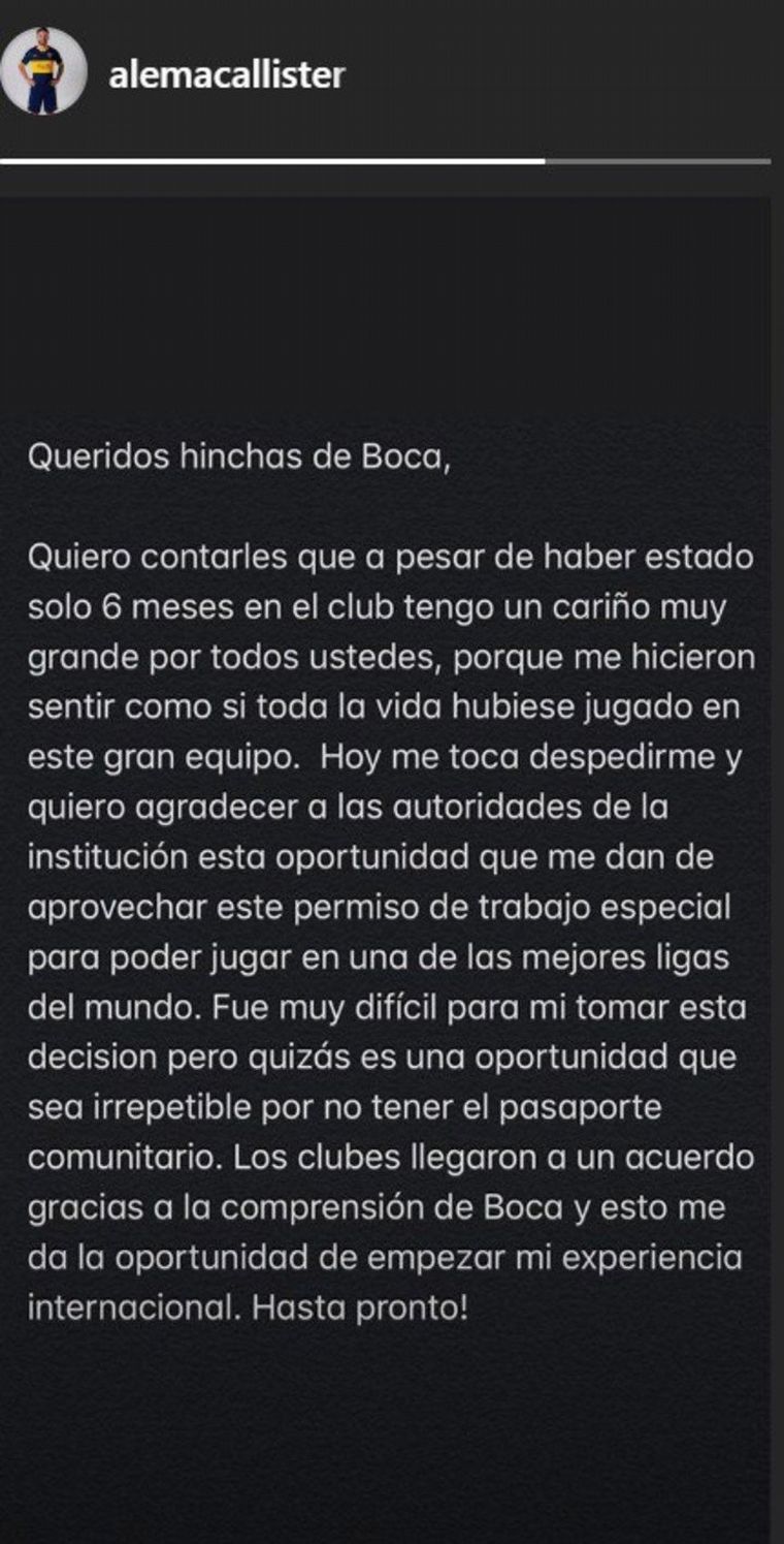 El total del pase de Mac Allister a la entidad británica es de 9 millones de euros y si bien en Boca se había indicado que el jugador prefería quedarse hasta mediados de año, desde el entorno del futbolista se manifestó lo contrario.