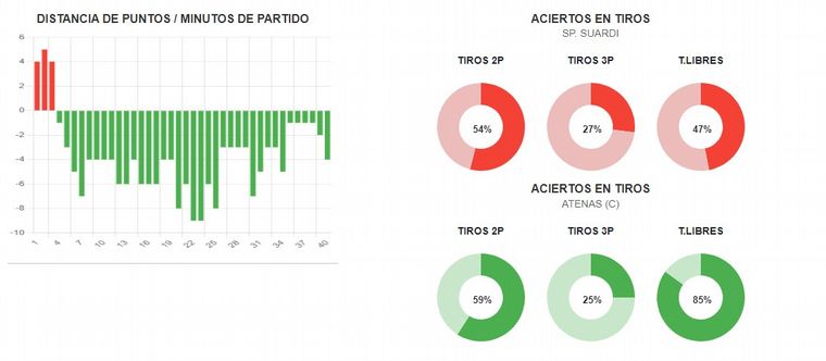 Otra vez, Atenas logró dominar casi de principio a fin el marcador y Suardi batalló desde atrás para no perderle pisada en ningún momento. La mayor diferencia del "Griego" en todo el partido fue de ocho puntos a favor y el local solo pudo ponerse al frente faltando 3 minutos y medio para el final. Aunque fue solo un suspiro.