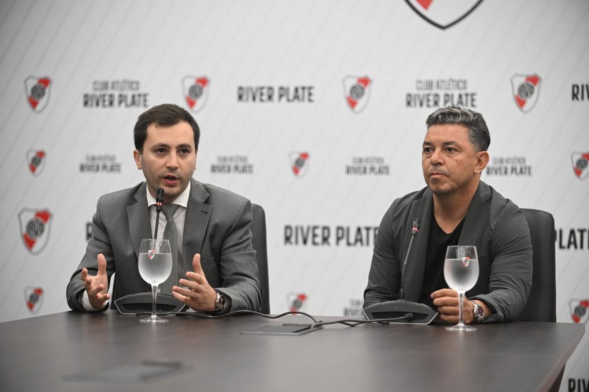 La primera medida de impacto fue anunciada apenas 72 horas después de asumir. A tres días de enfrentar a Boca en el superclásico, Di Carlo y Gallardo comunicaron la renovación anticipada del contrato del director técnico hasta diciembre de 2026. La decisión buscaba enviar un mensaje de estabilidad institucional en un momento donde el "Muñeco" había perdido su condición de intocable debido a los pobres resultados deportivos. Sin embargo, la reacción esperada en la cancha no se concretó: River perdió 2-0 ante Boca y cerró 2025 sin victorias bajo la nueva gestión.