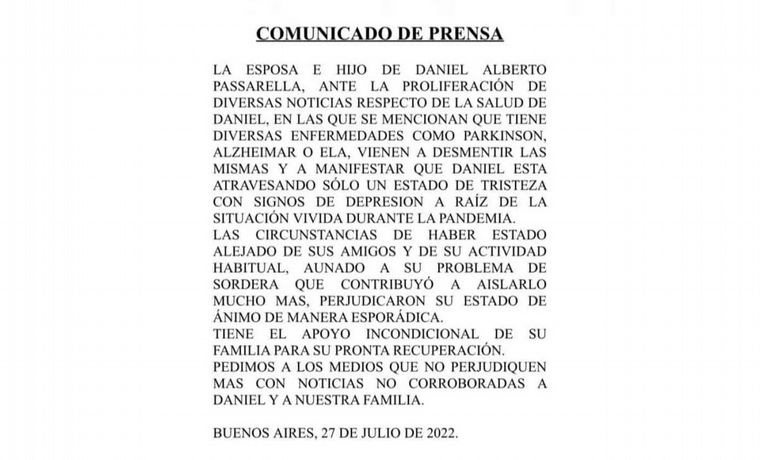 El círculo íntimo de Passarella ya había desmentido las versiones que circulaban sobre las presuntas enfermedades. El mensaje fue distribuido por su abogado, Marcelo Vázquez Aguiar: "La esposa e hijo de Daniel Alberto Passarella, ante la proliferación de diversas noticias de la salud de Daniel, en las que se mencionan que tiene diversas enfermedades como Parkinson, Alzheimer o ELA, viene a desmentir las mismas y a manifestar que Daniel está atravesando sólo un estado de tristeza con signos de depresión a raíz de la situación vivida por la pandemia".