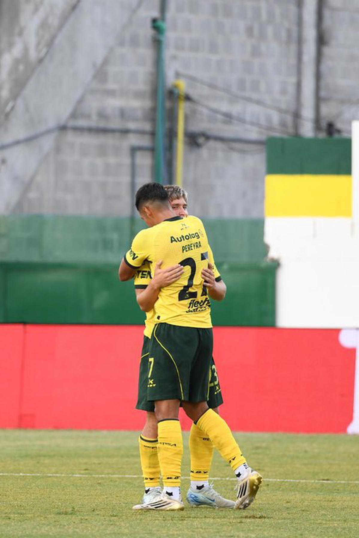 FOTO: Elías Pereyra festeja su gol, que abrió el partido, junto a Mateo Aguiar.