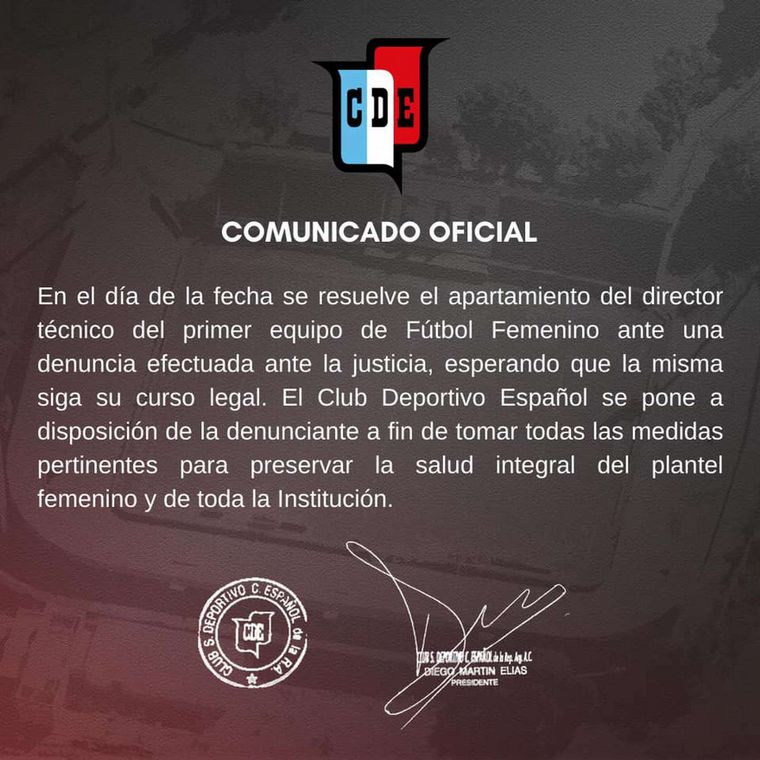 "Se pone a disposición de la denunciante a fin de tomar todas las medidas pertinentes para preservar la salud integral del plantel femenino y de toda la institución", publicó el club en sus redes sociales.