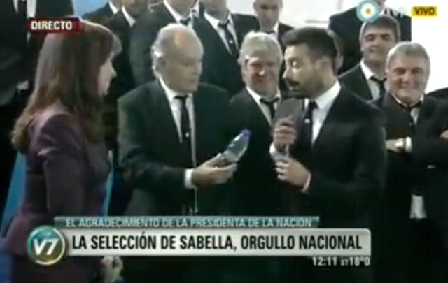 En el recibimiento de la presidenta Cristina Kirchner a los jugadores en el predio de la AFA, Alejandro Sabella le entregó una botella de agua a Ezequiel Lavezzi.