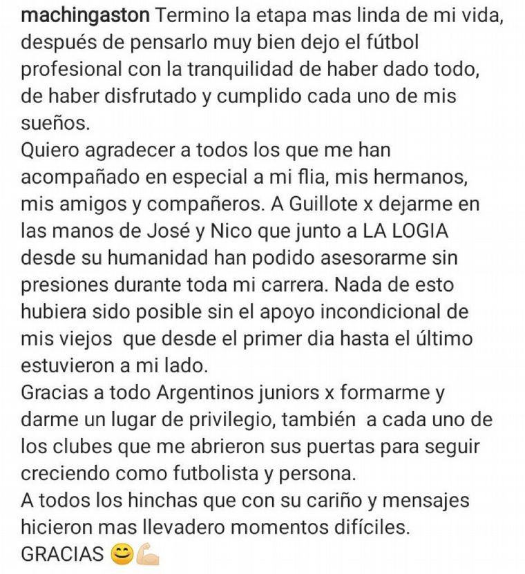 "Terminó la etapa más linda de mi vida, después de pensarlo muy bien dejo el fútbol profesional con la tranquilidad de haber dado todo, de haber disfrutado y cumplido cada uno de mis sueños", comenzó su texto en redes sociales.