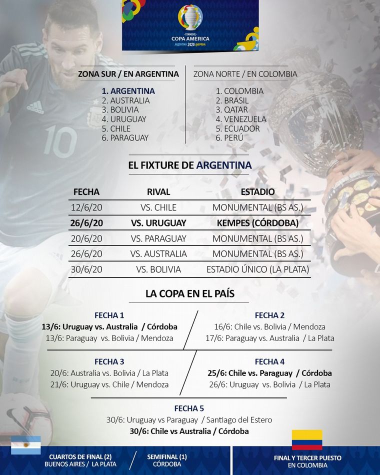 Argentina fue enrolada dentro de la zona Sur, distinguida con la letra A. El equipo del DT Lionel Scaloni compartirá ese grupo con los seleccionados de Chile, Uruguay, Paraguay, Bolivia y Australia, uno de los invitados especiales.