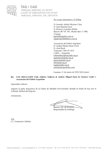 El Tribunal Arbitral del Deporte resolvió este lunes aceptar la medida cautelar presentada por la directiva de Talleres, suspendiendo los efectos de las sanciones impuestas por el Tribunal de Disciplina de AFA al presidente Andrés Fassi y al vicepresidente Gustavo Gatti, en el marco de los hechos ocurridos con el árbitro Andrés Merlos en el partido Talleres - Boca, por los octavos de final de Copa Argentina 2024 en Mendoza.