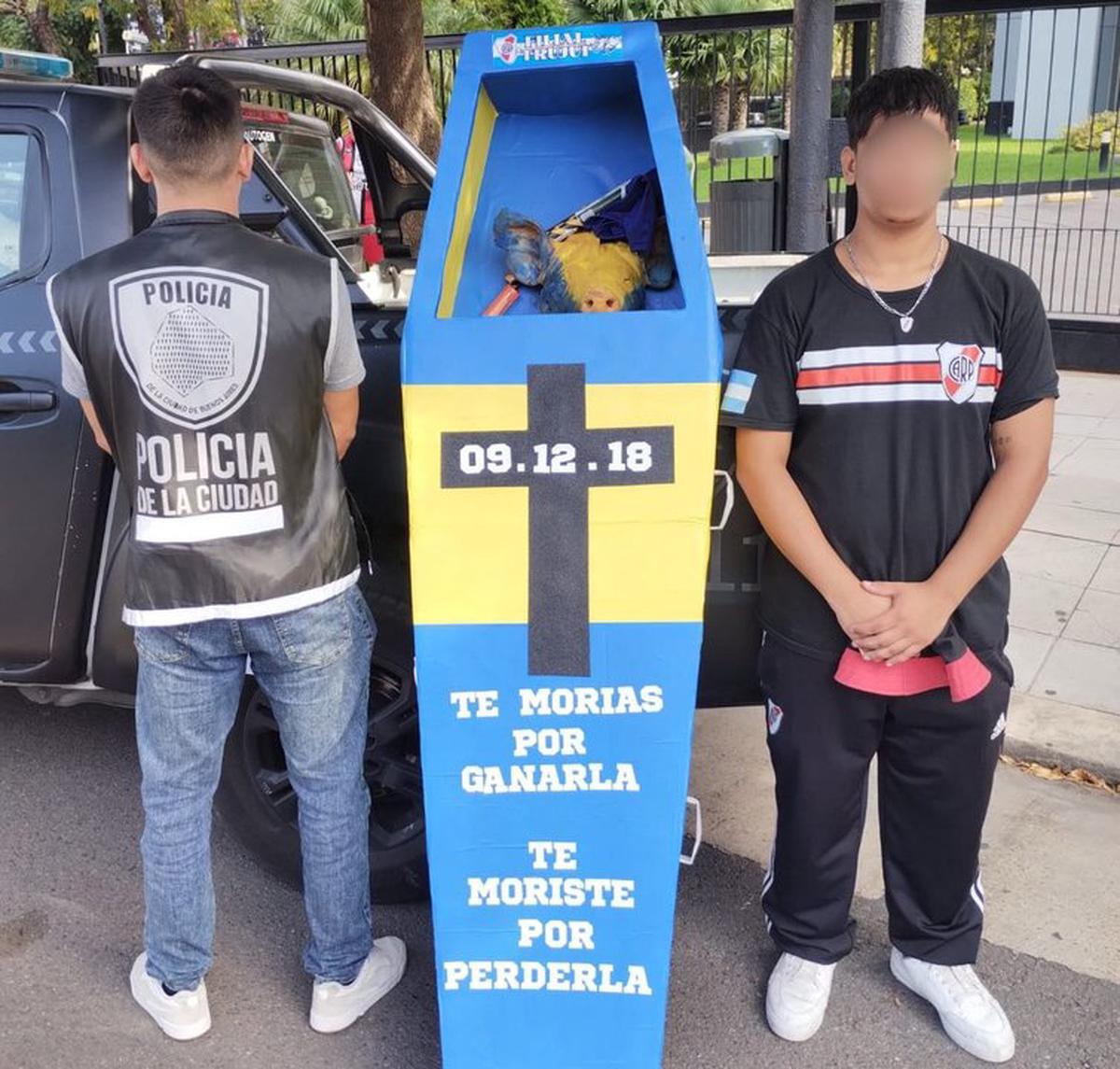 En un hecho llamativo, dos hombres fueron detenidos en avenida Del Libertador con ataúdes simbólicos que provocaban a la parcialidad contraria. Fueron sancionados y los ataúdes fueron secuestrados. Otros tres hinchas enfrentaron la misma sanción por portar carteles en forma de ataúdes.