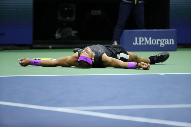 Al terminar, Nadal se lanzó al piso emocionado, escondiendo entre las manos las emociones de este partido que se quedó corto por cinco minutos de la final más larga en la historia del US Open.