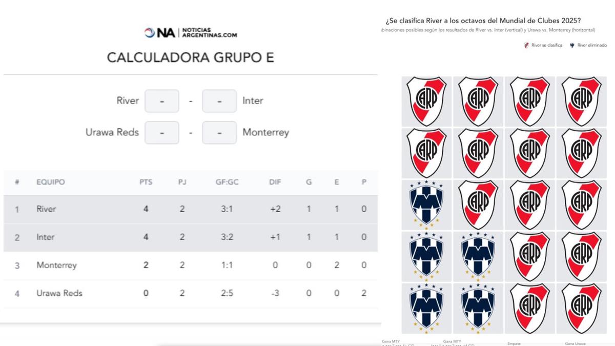 Paralelamente, la segunda calculadora permanece activa y ofrece la posibilidad de simular todos los escenarios posibles en el Grupo E, donde River se enfrentó a Inter de Porto Alegre. El otro partido de esta zona fue disputado por Urawa Reds y Monterrey. Este sistema cruzó los resultados factibles de ambos encuentros y reflejó si el equipo de Martín Demichelis se clasifica o queda afuera, utilizando visualizaciones claras con los escudos de River o Monterrey en cada combinación.