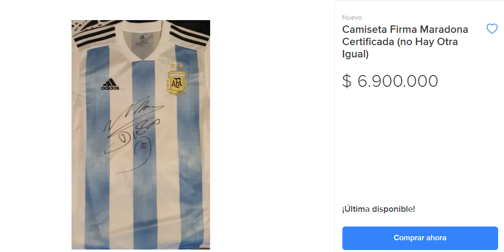 El sitio Mercado Libre presenta una buena cantidad de usuarios que pusieron en venta la camiseta autografiada. Una de ellas, correspondiente al seleccionado argentino, se consigue por 6,9 millones de pesos con la descripción "certificada (no hay otra igual)".
