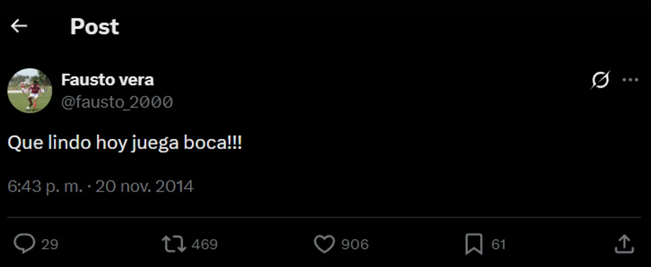 Buenos Aires, 18 diciembre (NA) -- Se filtró un antiguo posteo del mediocampista Fausto Vera, quien tiene todo acordado para convertirse en nuevo refuerzo de River, en el que demuestra fanatismo por Boca.