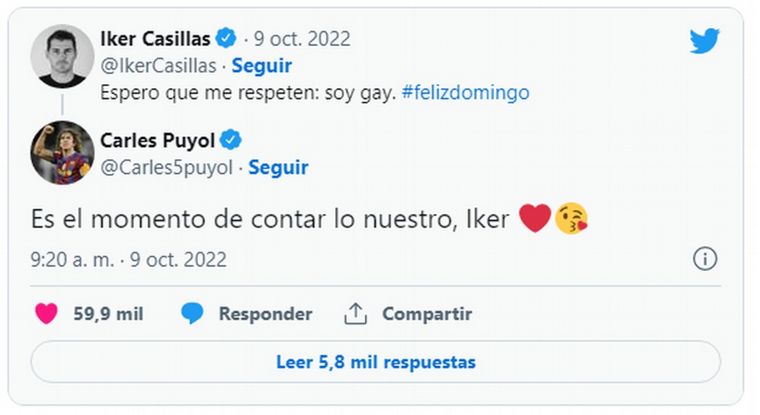 La publicación provocó miles de reacciones en Twitter, pero una de las que más llamó la atención es la de otro ilustre del fútbol español: Carles Puyol. El excapitán del Barcelona y compañero de selección de Iker no dudó en sumarse y contestó a modo de broma: “Es el momento de contar lo nuestro, Iker”, junto a los emojis del corazón y una cara que lanza un beso.