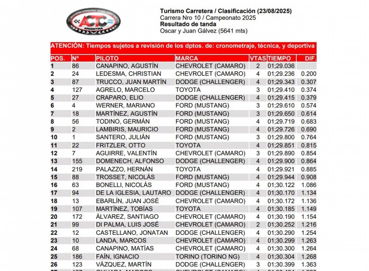 Detrás suyo, Ledesma sintió que no 'pegó el salto' que esperaba con la goma nueva y bajó Trucco pero quedó 2° a 0.200s. Y luego del Challenger ganador de 2024, se ordenaron Marcelo Agrelo -Toyota-, que es un gran candidato a la fase regular con esta clasificación, debido al retroceso de 5 posiciones de Santero, que se colocó detrás del quinto Elio Craparo -Dodge- y retrocede a la P11. Cuatro Ford Mustang completaron un Top 10 de lujo: con Mariano Werner, Agustín Martínez, Germán Todino y Mauricio Lambiris.
