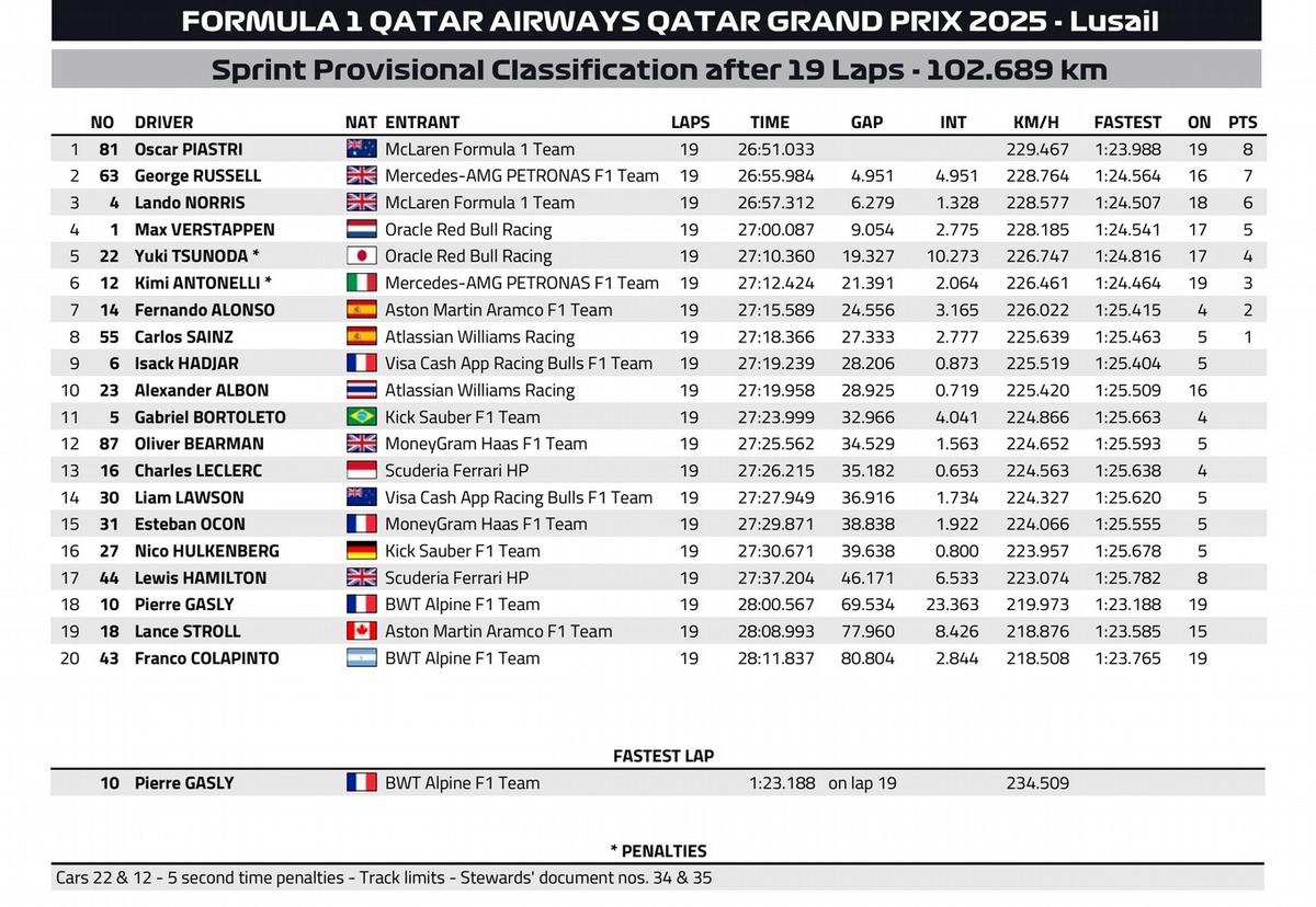 El australiano de McLaren, Oscar Piastri venció en el Sprint -19 vueltas- del Gran Premio de Catar de Fórmula 1 disputado con las primeras sombras de la noche en el Circuito Internacional de Losail, dejando detrás a George Russell de Mercedes y a su compañero y líder del certamen Lando Norris.