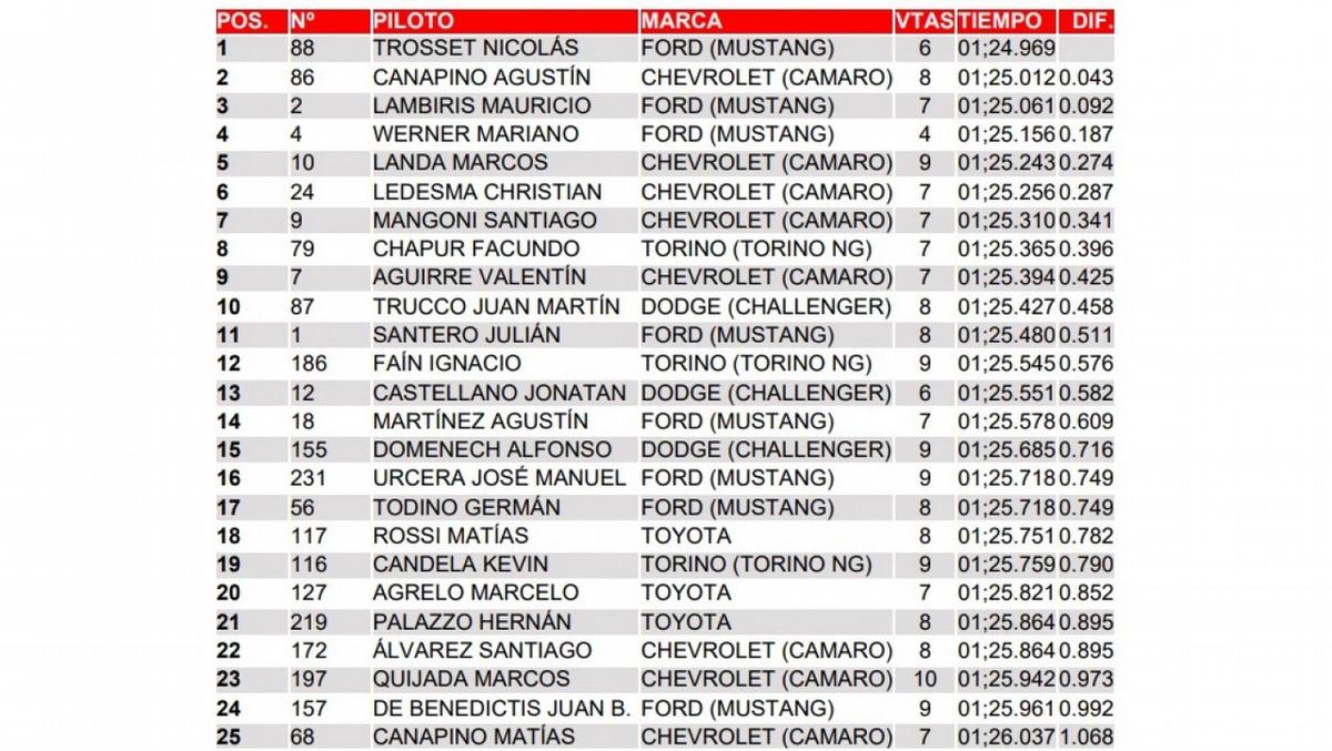 Todo hacía creer que los 'chivos' serían la gran amenaza del sábado en Paraná, pero cuando faltaban 2' minutos para la bandera de cuadros fue el Mustang azul de 'Nicky' Trosset el primero en romper la barrera del 1m25s y con una marca de 1,24.969s se quedó con la mejor vuelta de la primera práctica. Detrás de su marca, apareció la de Werner con el Mustang blanco para marcarle bien la respuesta del 'Óvalo' a los del 'Moño Dorado', poniéndose tercero provisionalmente. Pero los Camaro respondieron con el último giro de Canapino que se puso segundo a solo 43 milésimas de segundo de su vecino Trosset.