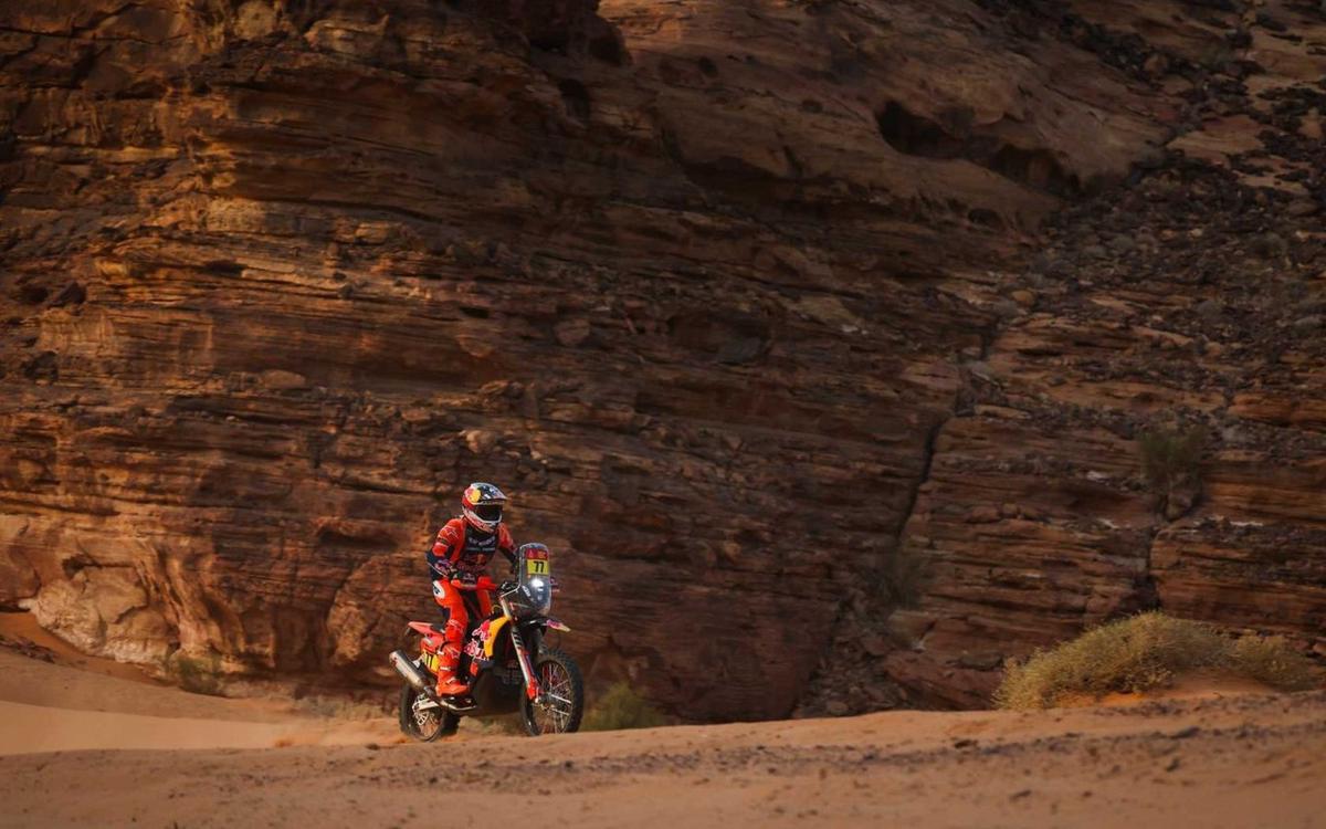 En un día invernal soleado (21°C), típico del interior saudita, corrieron desde el principio por desiertos amplios, saltando de un valle a otro en zig-zag entre los montes pequeños, con diferentes ritmos de velocidad. El día fue distinto, porque las motos siguieron su propio recorrido, distinto al de los coches. Para terminar en un campamento del desierto -también propio-, donde la única asistencia será la del propio piloto o la de algún colega que la ofrezca.