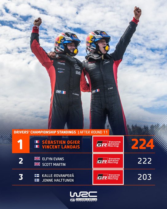El triunfo de Ogier, su segundo en otras tantas citas, también consolidó el estatus de Toyota como el fabricante más exitoso en la historia del WRC con 103 victorias. Le coloca dos puntos por delante de Evans en la clasificación de pilotos a falta de solo tres citas y, crucialmente, significa que Ogier abrirá pista en el Rally de Europa Central del próximo mes, una ventaja estratégica en tramos de asfalto.