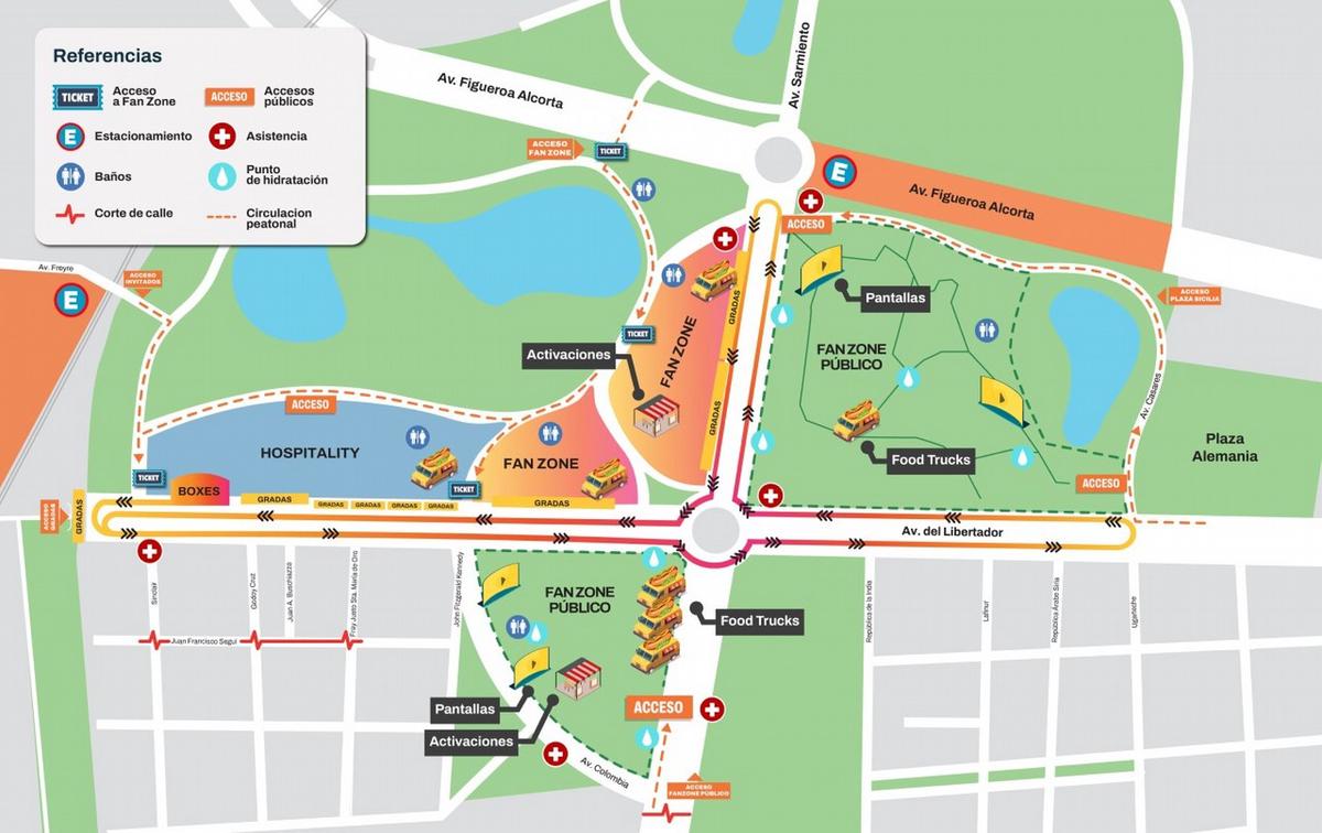 A partir de las 8.30 ya se podrá entrar a los sectores habilitados. Habrá dos grandes escenarios en plaza Seeber y plaza Sicilia con pantallas gigantes, donde se podrán ver las vueltas de Franco desde distintos ángulos, se harán entrevistas al público, habrá DJs y se presentará la Orquesta Sinfónica de la Ciudad, desde las 11. Tanto en las plazas Sicilia como Seeber no va estar permitido acampar. Y en la zona estará prohibida la venta ambulante.