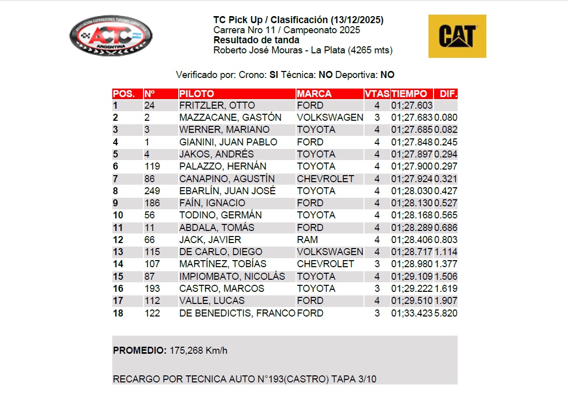 Con pronóstico de lluvia para este domingo, la primera serie será a las 9:15 horas con Fritzler y Werner en primera fila, en tanto que a las 9:40 será la segunda batería que tendrá a Mazzacane y Gianini en primera fila. Desde las 14:20 la final para consagrar al campeón de TC Pick Up 2025.