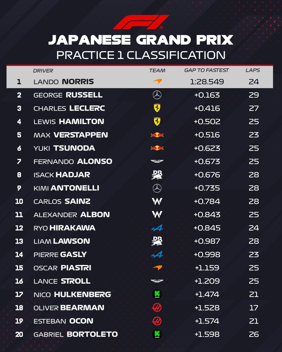 El piloto británico Lando Norris, de McLaren, marcó el ritmo en la primera sesión de entrenamientos libres del Gran Premio de Japón de Fórmula 1, que se disputa este fin de semana en el histórico Circuito de Suzuka -5.807 mts.-. Fue seguido por George Russell de Mercedes y por Charles Leclerc de Ferrari. Mientras que, el japonés Yuki Tsunoda debutó oficialmente con una actuación muy correcta en el Red Bull Racing.