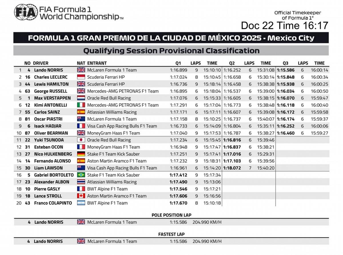 Lando Norris consiguió con autoridad una impresionante pole position en para el Gran Premio de la Ciudad de México de Fórmula 1. El británico lideró la clasificación, por delante de la dupla de Ferrari formada por Charles Leclerc y Lewis Hamilton, mientras que su compañero de equipo en McLaren, Oscar Piastri, terminó la sesión en octavo lugar.