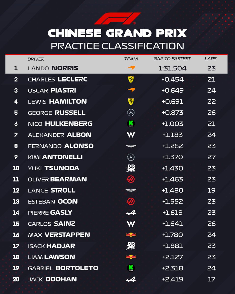 El último ganador y puntero del campeonato Lando Norris, de McLaren, lideró el entrenamiento único del Gran Premio de China de Fórmula 1, desarrollado en el Circuito Internacional de Shangai -5.451 mts.- en un día soleado sobre una excelente pista reasfaltada donde este fin de semana se pone en marcha el primer programa F1 Sprint de la temporada.