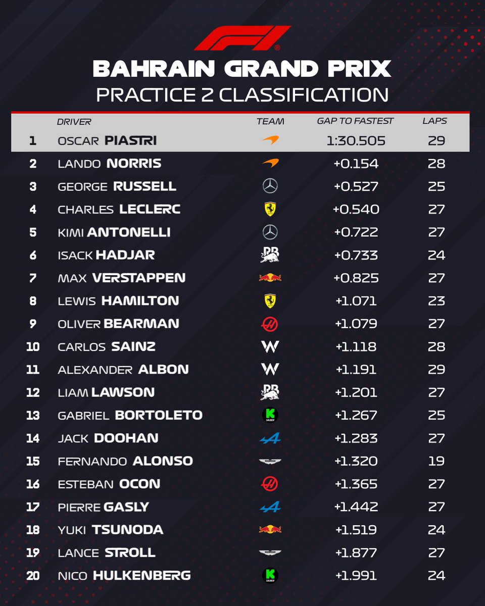 Los coches anaranjados también lideraron la práctica nocturna en la primera jornada del GP de Baréin. A más de medio segundo, quedaron Russell, Leclerc y Antonelli, completando el Top 5.