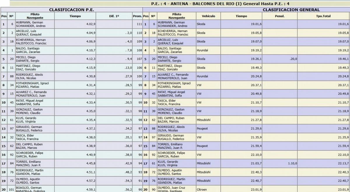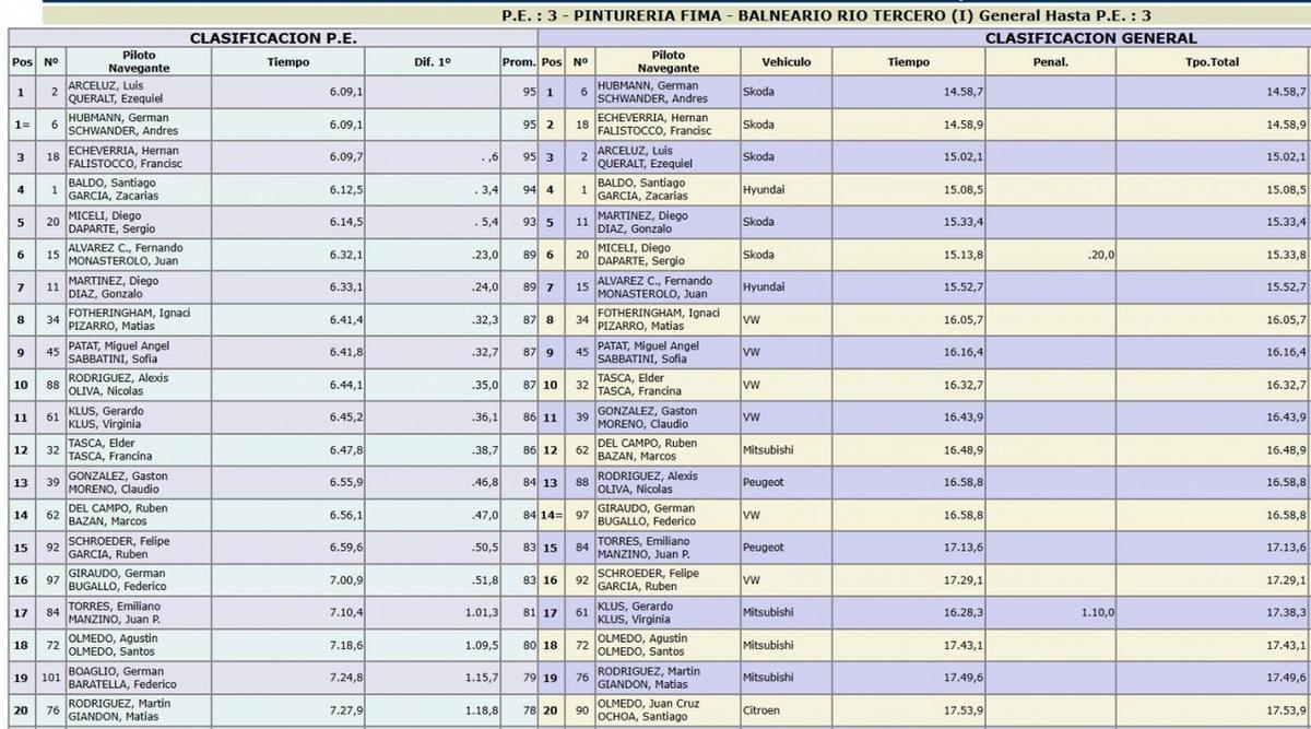 En la PE3 Balneario Río Tercero -10 kms.-, Arceluz y Hubmann fueron los que empataron el primer tiempo, demostrando la gran paridad que hay en la disputa por la carrera, y con Echeverría manteniéndose a menos de 1" segundo. Para que la tripulación del DS Sport regrese al tope de la general, en un rally en el que -hasta allí- el puntero nunca había superado el segundo de diferencia con su escolta.