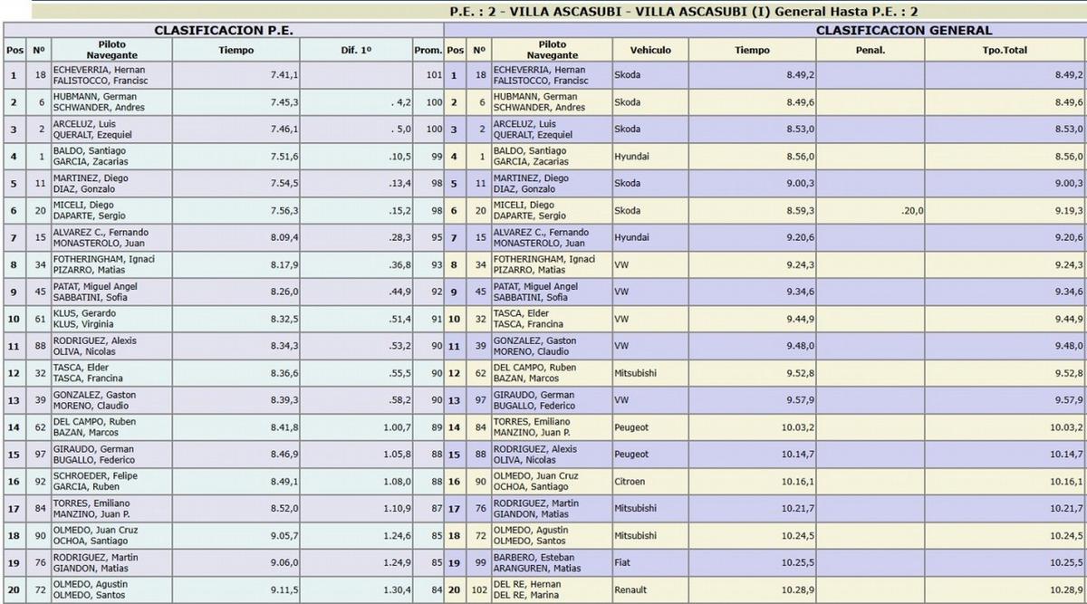 La PE2 Villa Ascasubi -13 kms.-fue una primera prueba con bastante humedad, donde Echeverría marcó el mejor tiempo y quedó al frente al frente de la general postergando al de Canals.