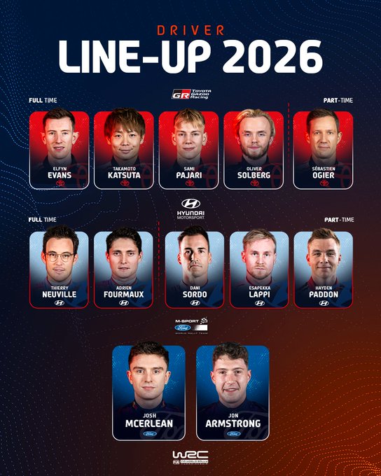 El Hyundai Motorsport continúa con su i20 N Rally1, manteniendo programas completos para el belga ex campeón Thierry Neuville y el rápido francés Adrien Fourmaux. La pérdida de Ott Tänak -año sabático-, será cubierta con el concurso de Dani Sordo, Esapekka Lappi y Hayden Paddon, en programas parciales. Hyundai también piensa en desarrollar su coche de Rally2 como base para su WRC27.