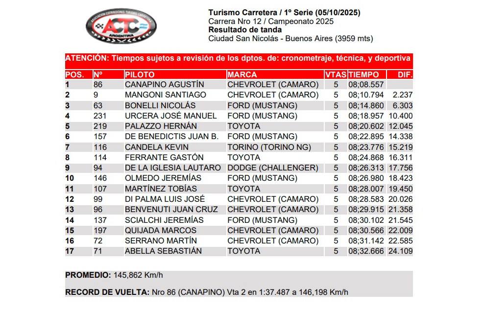 Matías Rossi de Toyota, Agustín Canapino de Chevrolet y Facundo Chapur de Torino, se impusieron partiendo desde la pole en sus respectivas serie clasificatorias y estarán -en ese orden- a la cabeza de la final de la Fecha 12ª del Campeonato Argentino de Turismo Carretera 2025 que se pondrá en marcha a las 13:30 hs. en el Autódromo 'San Nicolás Ciudad' -4.000 mts.-, donde el clima todavía no está definido para la carrera.
